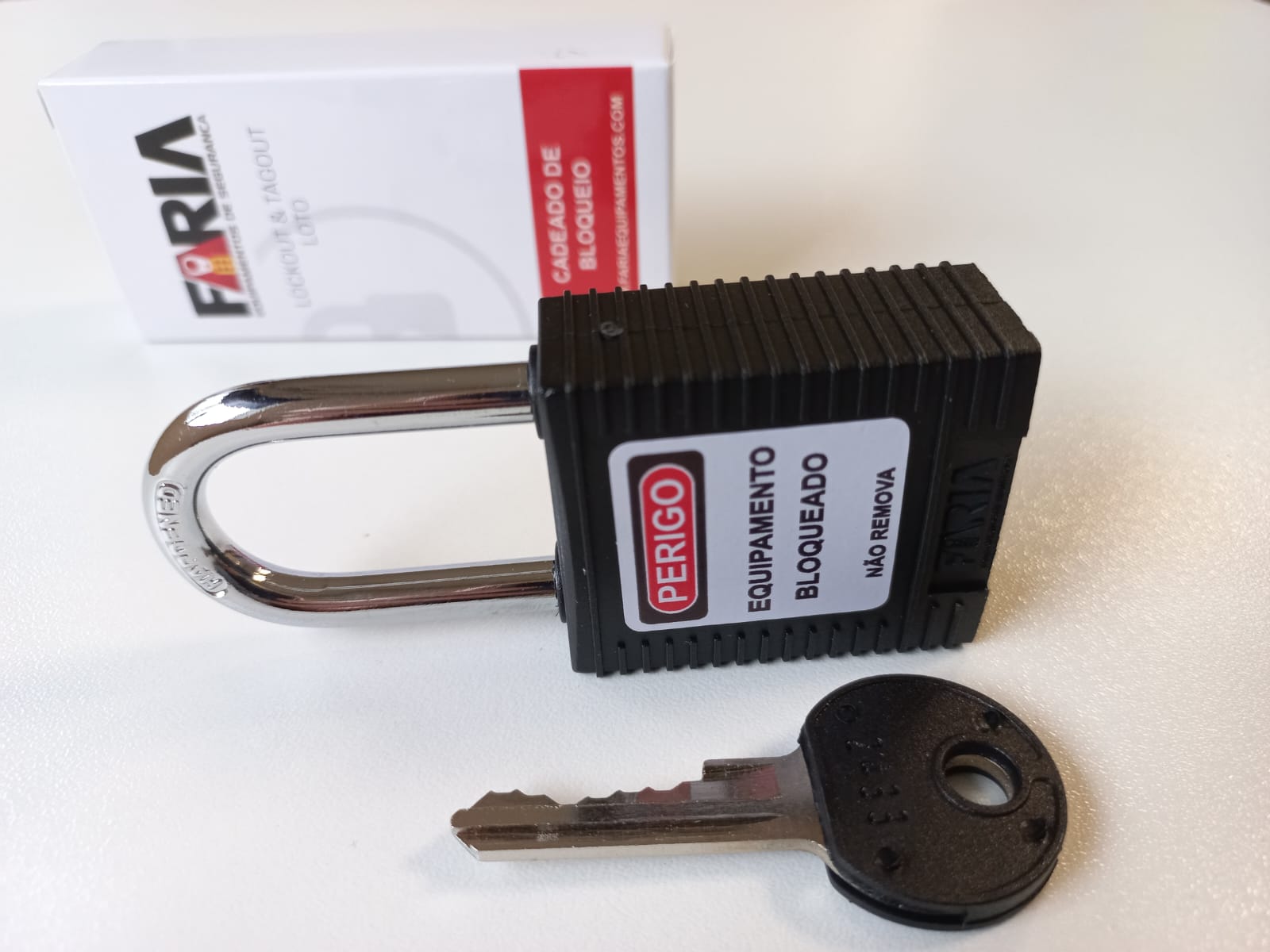 Cadeado de Bloqueio com corpo confeccionado em Nylon não condutor elétrico de dimensionamento (A 45 x L 38 x P 20) e haste em Metálica Cromada de 6,3mm e 38mm de altura interna. Seu projeto desenvolvido com grip, proporciona maior estabilidade durante o manuseio operacional. Modelos disponíveis com 1 ou 2 chaves de 6 pinos, acompanham capa na mesma cor e com número de codificação realizados à laser idênticos ao corpo do cadeado, proporcionando isolamento elétrico e rastreabilidade. Adesivo dupla face com legenda no idioma Português-BR.