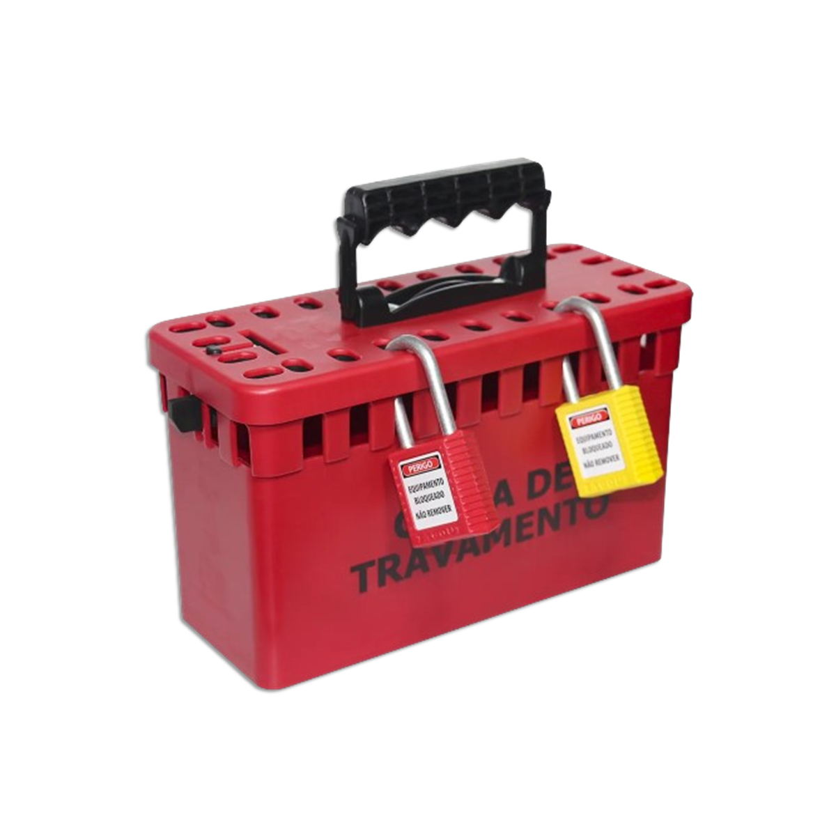 A Caixa de Bloqueio Plástica para 26 Cadeados é indicada para bloqueios em grupo. O responsável pelo bloqueio deve realizar o bloqueio da máquina ou equipamento e colocar a chave do seu cadeado dentro da caixa de travamento plástica de 26 furos, enquanto os demais técnicos que participarão da manutenção deverão colocar seus cadeados e etiquetas nos orifícios presentes na tampa da caixa, impedindo assim que a tampa seja aberta antes da conclusão dos trabalhos.