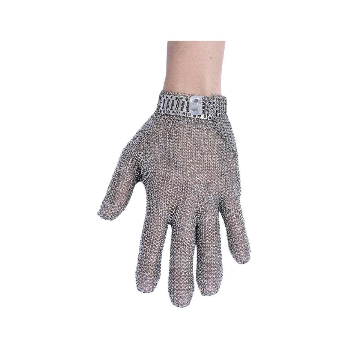 Luva de segurança confeccionada em malha de aço, fio inox 304L – 0,55 mm de diâmetro.