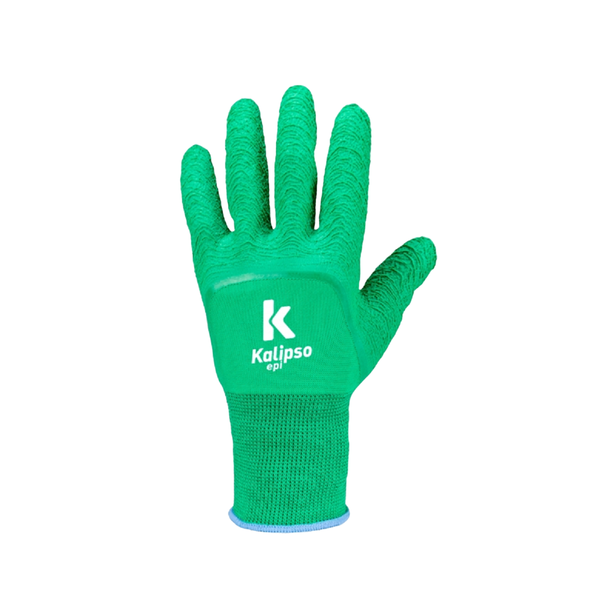 Luva de segurança, tricotada em fios de poliéster, revestimento em látex corrugado na palma, dedos e parte do dorso, punho em elástico.