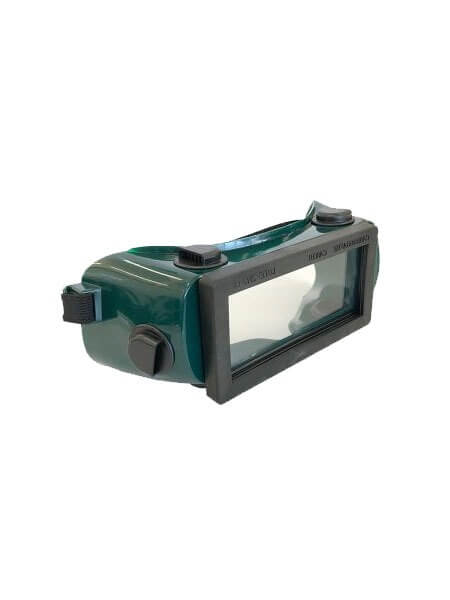 Óculos de segurança, constituído de armação confeccionada em uma única peça injetada em pvc, dotada de uma abertura (visor) retangular de aproximadamente 46 mm de largura e 100 mm de comprimento na qual se encaixa um suporte retangular de material plástico rígido preto que é utilizado para a colocação do filtro de luz e da placa de cobertura ou da placa de segurança. Quando o suporte é dotado apenas da placa de segurança, a ele deve ser acoplado um outro suporte basculante em que é colocado o filtro de luz e a placa de cobertura. As placas de segurança e de cobertura são confeccionadas em policarbonato incolor. A armação é dotada de seis válvulas para ventilação indireta, e tirante elástico para ajuste.