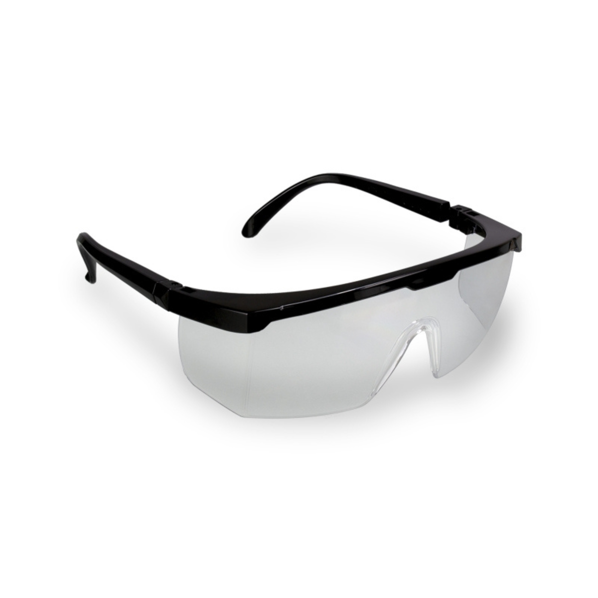 Óculos de proteção, constituídos de arco de material plástico (nylon) com meia-proteção nas bordas, um pino central alfinete e duas fendas nas extremidades da armação utilizadas para o encaixar de visor confeccionado em policarbonato com um furo central para encaixe do pino do arco, apoio nasal e protetor lateral injetado no mesmo material do visor com uma fenda em cada extremidade para o encaixe no arco, hastes do tipo espátula confeccionado do mesmo material que o arco e constituídas de duas peças: semi-haste vazada com uma extremidades presas ao arco por meio de parafuso metálico e outra semi-haste vazada que se encaixa na semi-haste anterior e permite regulagem de tamanho.
